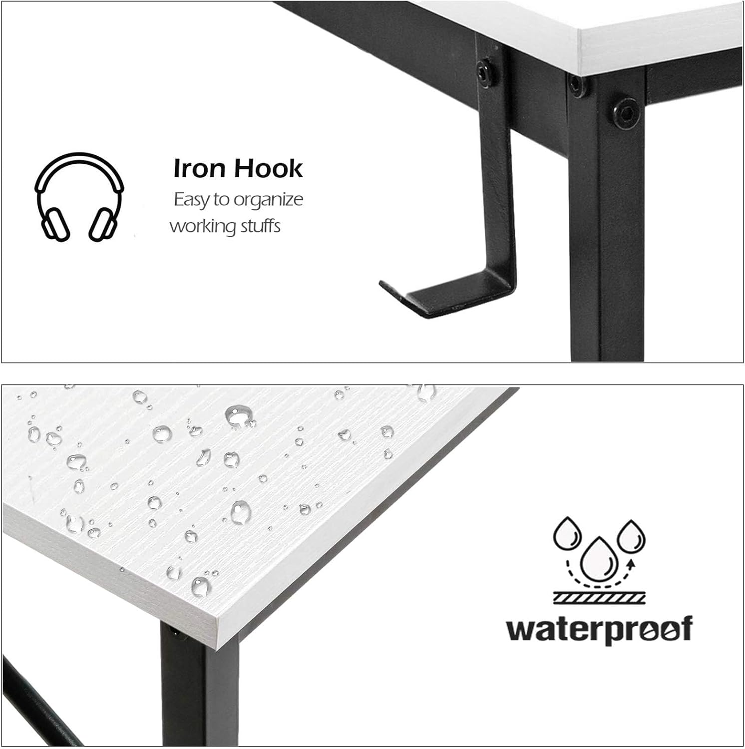 Modern Simple Style Design: Desk is made of thick Particle board with scratch-resistant, anti-collision and waterproof, protect home office desk surface from daily wear and tear, Brown desktop match black metal frame ,with storage bag and Headphone hook ( Both Removable ) .